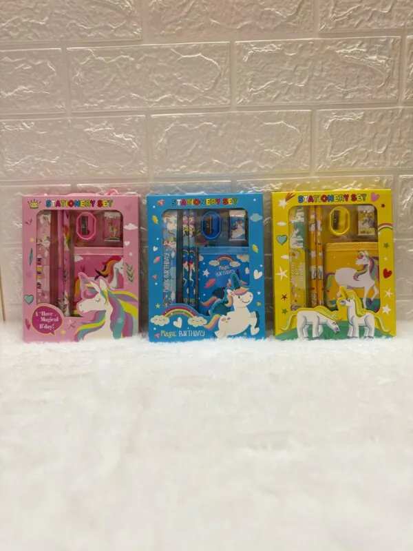 This cute Dino & Unicorn Stationery Kit includes a wallet, two pencils, an eraser, a sharpener, and a scale—perfect for school, homework, and creative fun!
